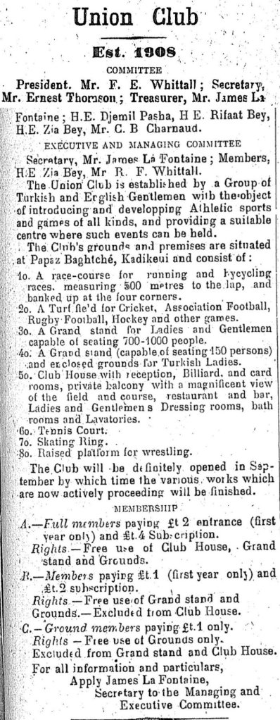 Union Club, atletik ve spor oyunlarının bütün çeşitlerinin gelişimi ve tanıtımı için ve bu sportif cereyanları icra etmek için uygun bir mecra sağlamak üzere Türk ve İngiliz centilmenleri tarafından tesis edilmiştir. Kulüp saha bina ve müştemilatı, Kadıköy Papaz Bahçesi’ne yerleştirilmiştir ve şunları içerir: