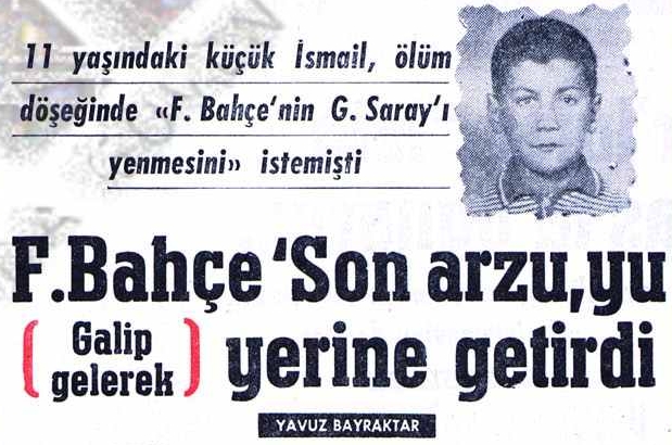 7 Ekim 1967 tarihinde 11 yaşındaki bir Fenerbahçeli vefat etti. Ertesi gün Milliyet gazetesinde bir ölüm ilanı yayınlandı. Gerçi ilanda herhangi bir son arzu görünmüyordu ama aynı gün oynanan ve Fenerbahçe’nin Galatasaray’ı 2-0 yendiği futbol maçının haberi, göz dolduran cinstendi. Önce vefat ilanını okuyalım, sonra da haberi…