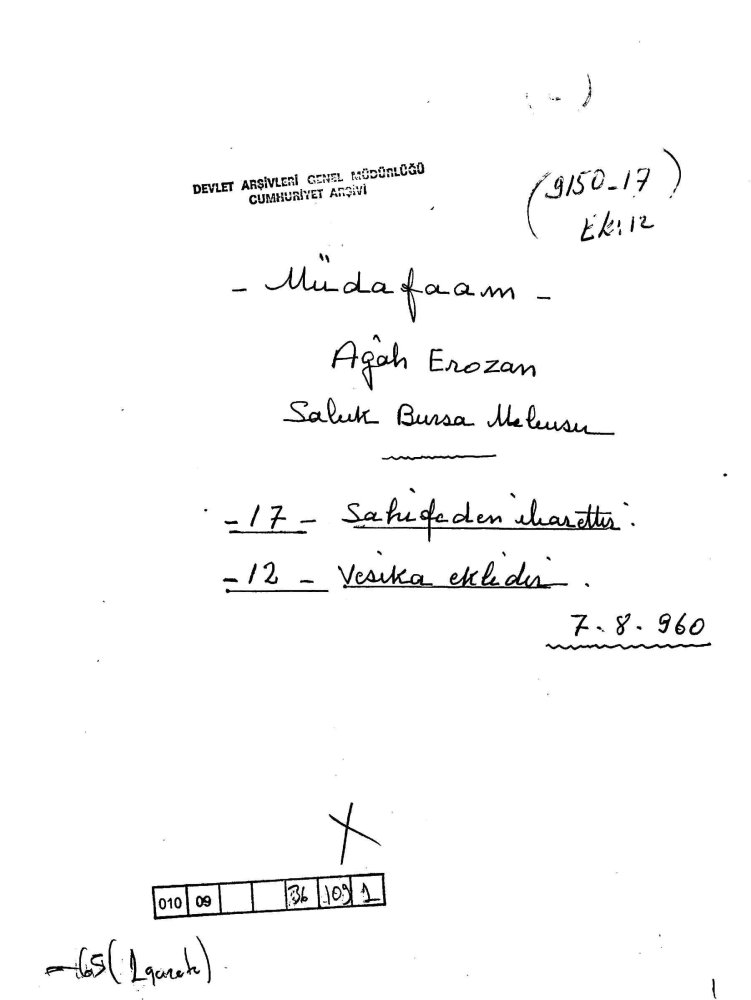 Erozan’ın Yassıada duruşmaları başlamadan soruşturma komisyonuna yaptığı savunmanın kapak sayfası (Cumhurbaşkanlığı Devlet Arşivinden)
