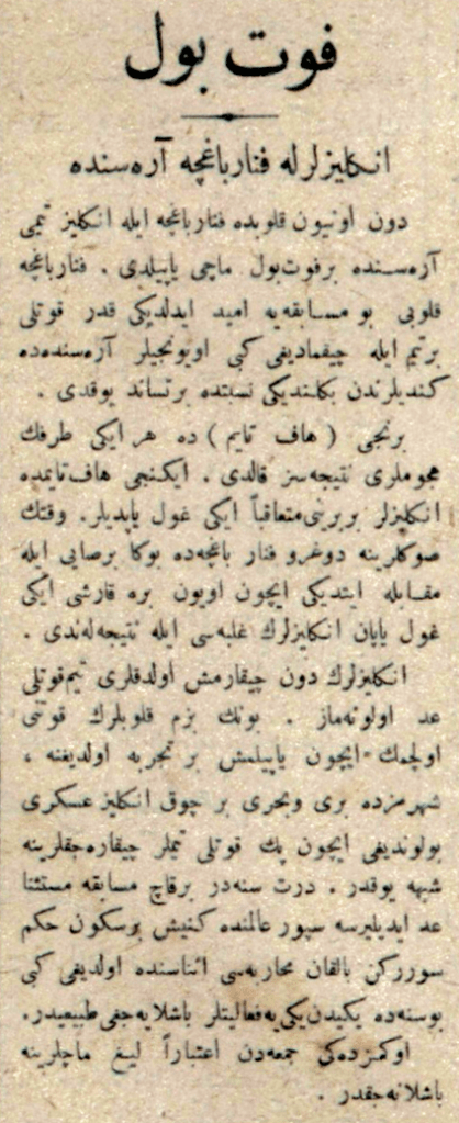 “Dün Union Kulüp’te Fenerbahçe ile İngiliz Takımı arasında bir futbol maçı yapıldı. Fenerbahçe kulübü bu müsabakaya ümit edildiği kadar kuvvetli bir takım ile çıkamadığı gibi oyuncular arasında da kendilerinden beklendiği ölçüde bir yardımlaşma yoktu.Birinci yarıda her iki tarafın hücumları sonuçsuz kaldı. İkinci yarıda İngilizler ard arda iki gol yaptılar. Maçın sonlarına doğru Fenerbahçe de buna bir sayı ile karşılık verdiği için oyun bire karşı iki gol yapan ingilizlerin galibiyeti ile sonuçlandı. İngilizlerin dün çıkarmış oldukları takım kuvvetli kabul edilemez. Bunun bizim kulüplerin kuvvetini ölçmek için yapılmış bir tecrübe olduğuna, şehrimizde bir çok ingiliz askeri bulunduğu için pek kuvvetli takımlar çıkaracaklarına şüphe yoktur. Dört senedir birkaç müsabaka haricinde spor aleminde geniş bir durgunluk hüküm sürerken, Balkan muharebesi esnasında olduğu gibi bu sene de iyiden iyiye faaliyetler başlayacağı tabidir. Önümüzdeki cumadan itibaren lig maçlarına başlanacaktır.”