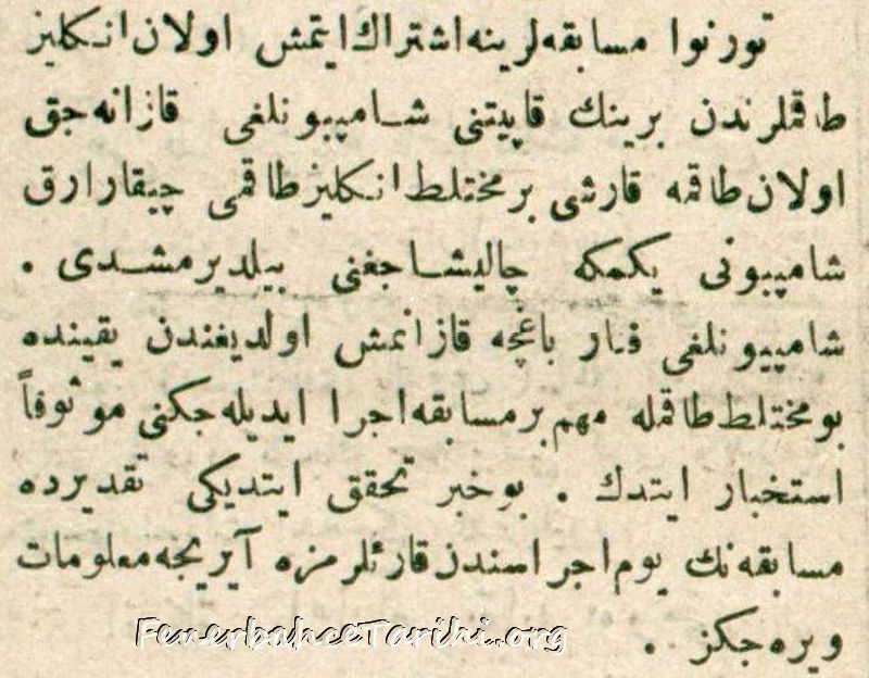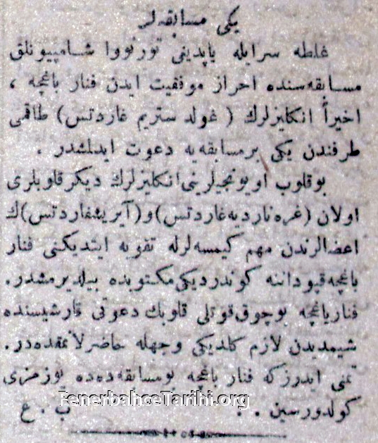 Fenerbahçe Spor Kulübü’nün turnuva şampiyonluğunu kazanan birinci futbol takımı –şampiyon çıktığı için- İngilizler tarafından maça davet edilmiş ve Fenerbahçe de bu daveti kabul etmişti. Müsabaka yarın öğleden sonra beş buçukta Taksim Stadyumu’nda icra edilecektir. Fenerbahçe maruf takımıyla, yani kaleci Şekip; müdafaa Cafer ve Hasan Kamil; muavin Fahir, İsmet ve Kadri; muhacim Sabih, Alaaddin, Zeki, Ömer ve Bedri Beylerden mürekkeb takımıyla sahaya çıkacaktır. Ancak ayağı burkulmuş olan Ömer Bey’in adem-i iştiraki halinde ya Bedri Bey içeri alınarak yerine ikinci takımdan Burhaneddin Bey konulacak veyahut muavin Fahir Bey sol iç muhacim mevkiine geçirilip muavin olarak Süleymaniye kulübünden Osman Nuri Bey oynayacaktır.