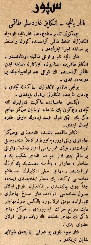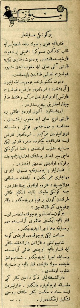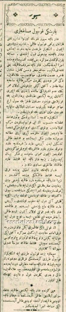 Şehrimizde bulunan İngiliz takımlarının en mahir oyuncularından mürekkeb olarak çıkarılan muhtelit takımla Fenerbahçe birinci takımı arasında gün Beyoğlu’nda Taksim Stadyumu’nda heyecanlı bir futbol maçı icra edilmiştir. Oyun başlayınca İngilizler Fenerbahçe kalesi önünden topu ayırmamışlar ve bu sırada bir gol yapmaya muvaffak olmuşlardır.
