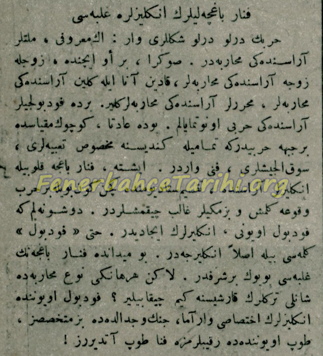 Harbin türlü türlü şekilleri var : En marufu, milletler arasındaki muharebedir. Sonra, bir ev içinde zevcle zevce arasındaki muharebeler, kadın ana ile gelin arasındaki muharebeler, muharrirler arasındaki muharebeler gelir. Bir de futbolcular arasındaki harbi unutmayalım. Bu da adeta, küçük mikyasta bir cephe harbidir ki tamamıyla kendisine mahsus tabiyeleri, sevkülceyşleri, fenni vardır. İşte, Fenerbahçe kulübüyle İngilizler arasında, Taksim Stadyumu’nda geçen gün böyle bir harb vukua gelmiş ve bizimkiler galip çıkmışlardır. Düşünelim ki futbol oyunu, İngilizlerin icadıdır. Hatta “futbol” kelimesi bile aslen İngilizcedir. Bu meydanda Fenerbahçe’nin galebesi büyük bir şereftir. Lakin herhangi nev’i muharebede şanlı Türklerin karşısına kim çıkabilir? Futbol oyununda İngilizlerin ihtisası var ama, cenk ve cidalde de biz mütehassısız, top oyununda da rakiplerimize fena top attırırız.
