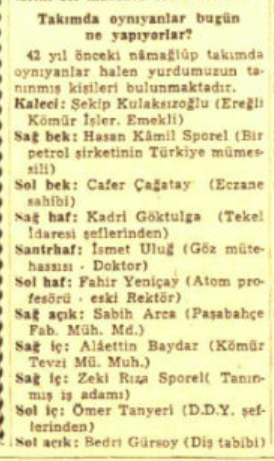 Forvet : Alaaddin Baydar – Bedri Gürsoy – Ömer Tanyeri – Sabih Arca – Zeki Rıza Sporel
