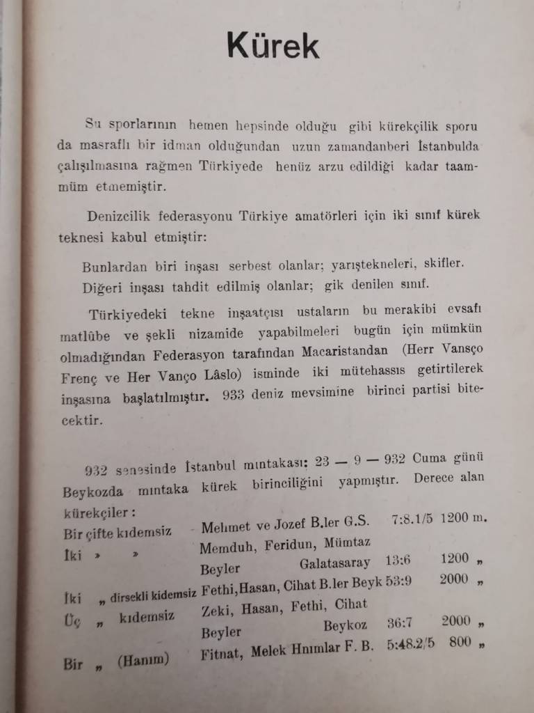 Bu kitapçığa göre 1914 senesinde tertip edilen deniz müsabakalarında yelken yarışları da yapılmıştır ama bu tarihten 1932 senesine kadar bir daha yelken yarışı icra edilmemiştir. Hâlbuki 1917 senesinde donanma yararına yapılan ve devrin güçlü adamı Enver Paşa’nın start verdiği yarış vardır. Neyse, bu olayı genç Cumhuriyetin hassasiyetine bırakıp biz tekrar yazılanlara dönelim.