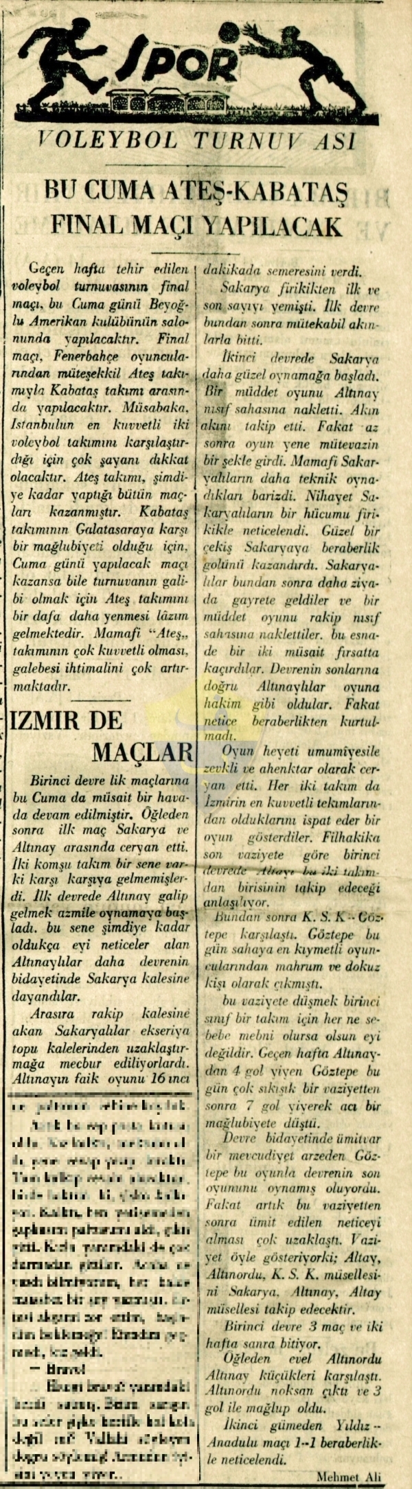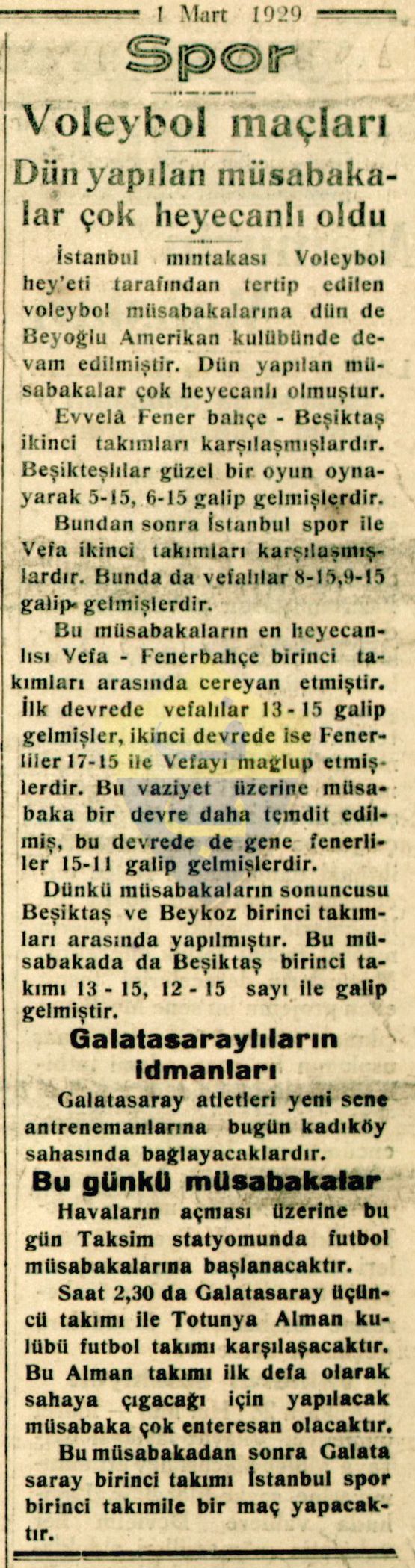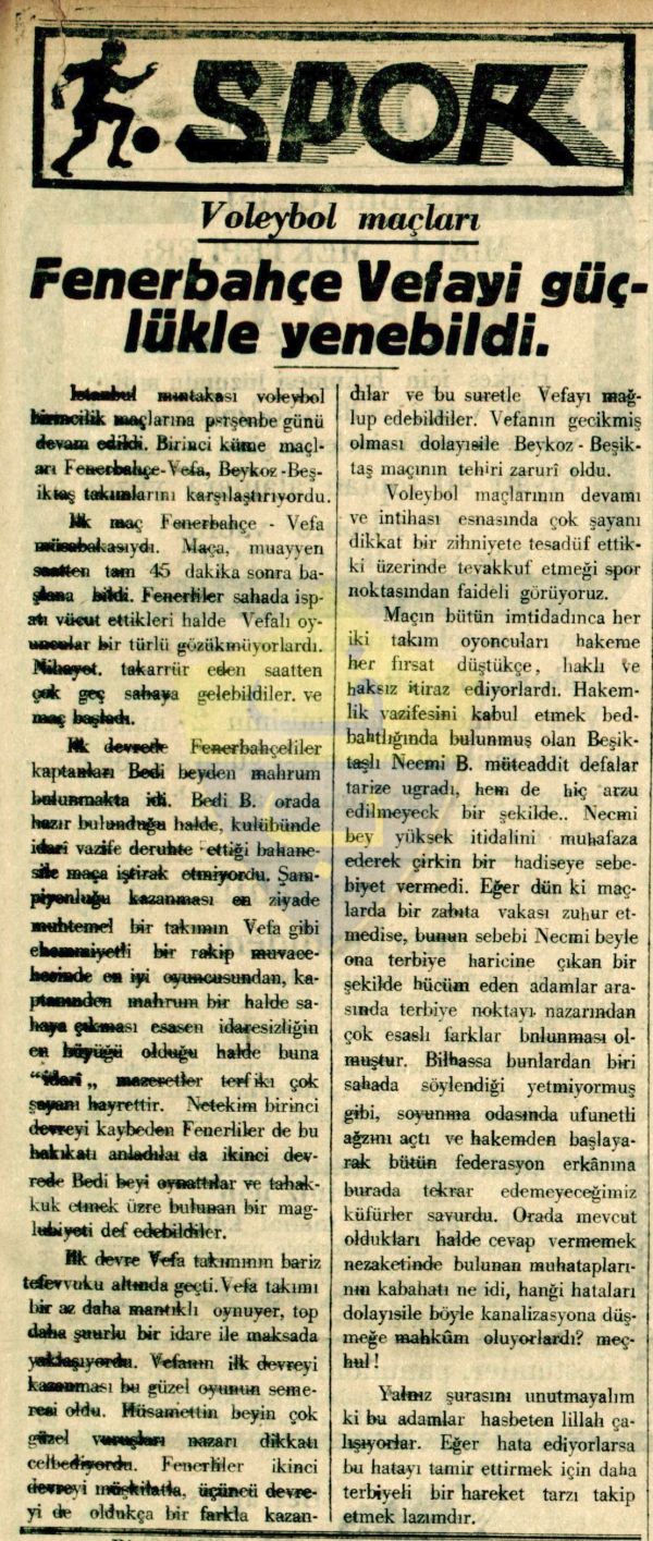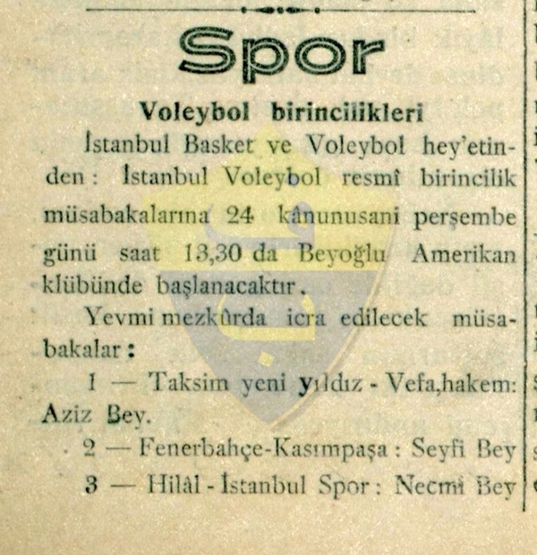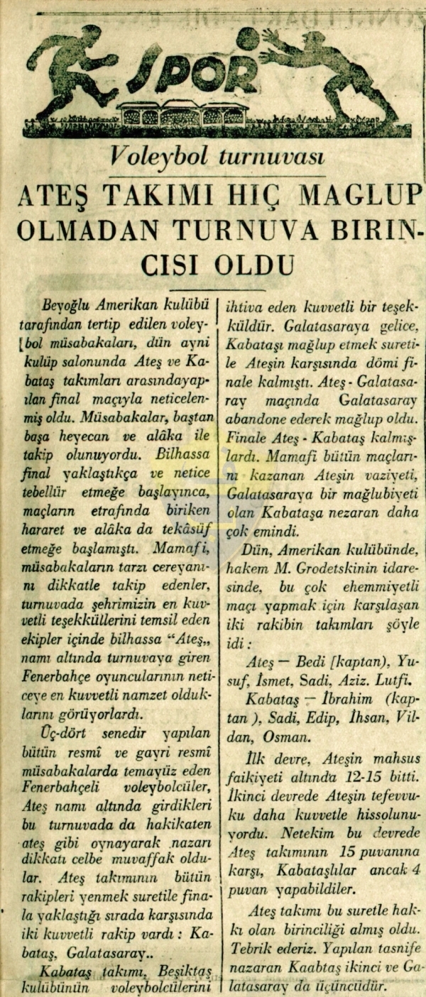 Voleybol Turnuvası Neticelendi. Mühendis Mektebi (Fenerbahçe) birinci, Kabataş ikinci, Galatasaray üçüncü oldular.