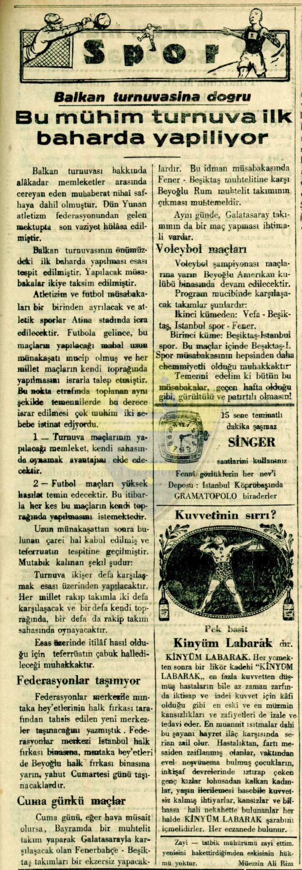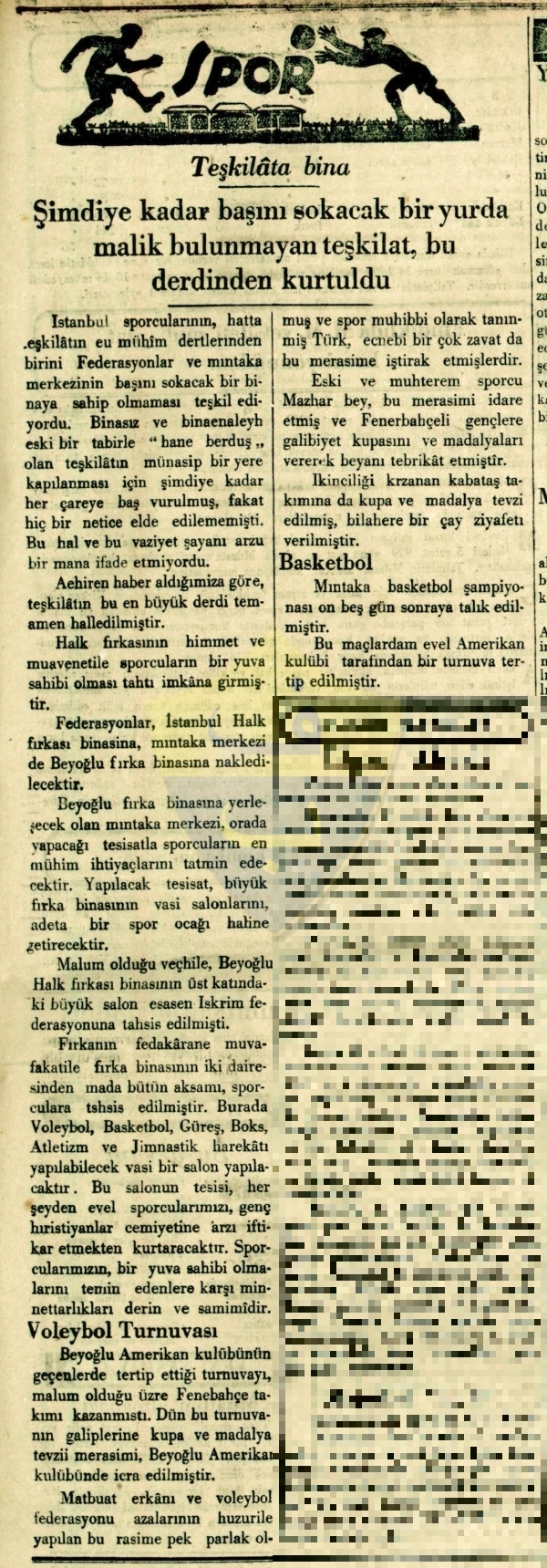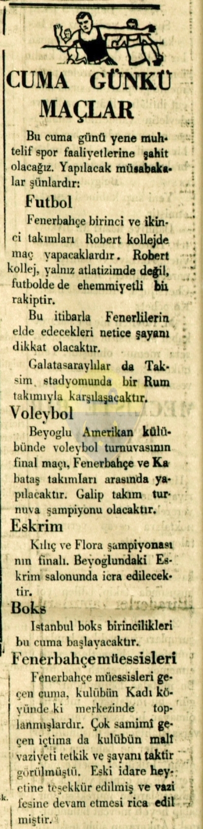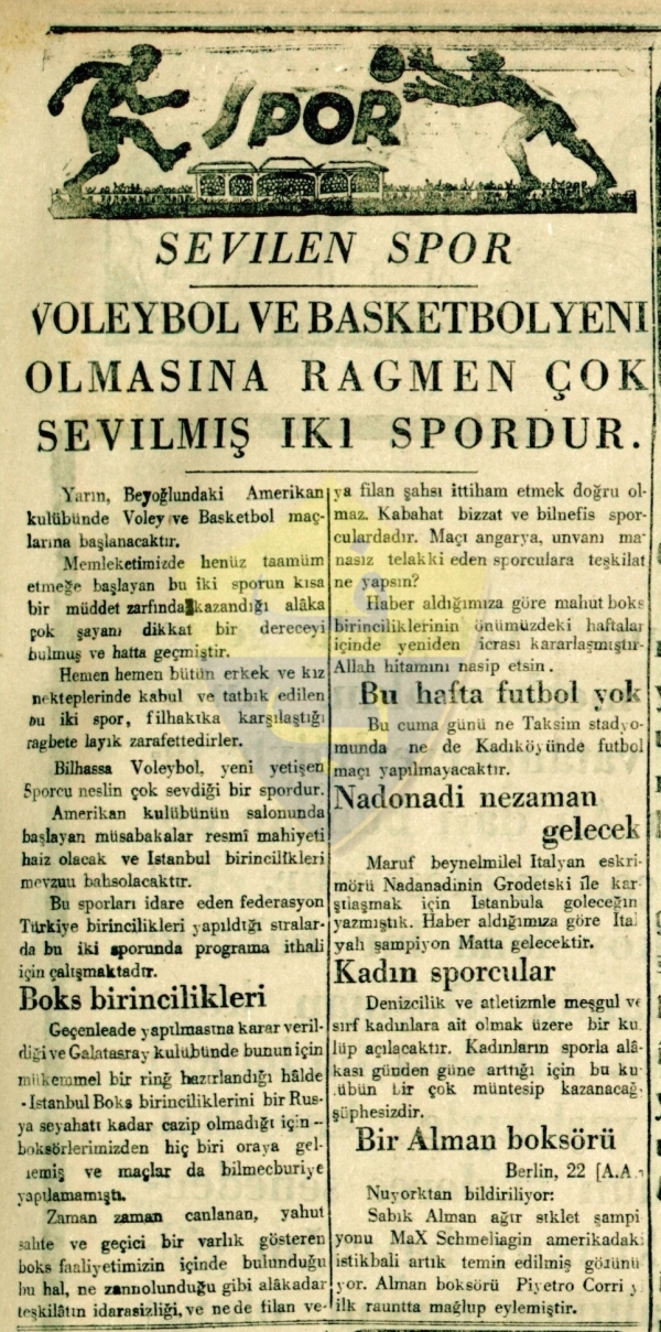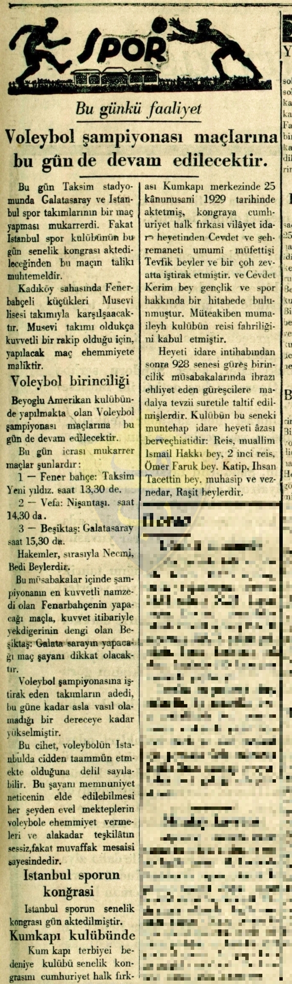 Voleybol Turnuvası Neticelendi. Mühendis Mektebi (Fenerbahçe) birinci, Kabataş ikinci, Galatasaray üçüncü oldular.